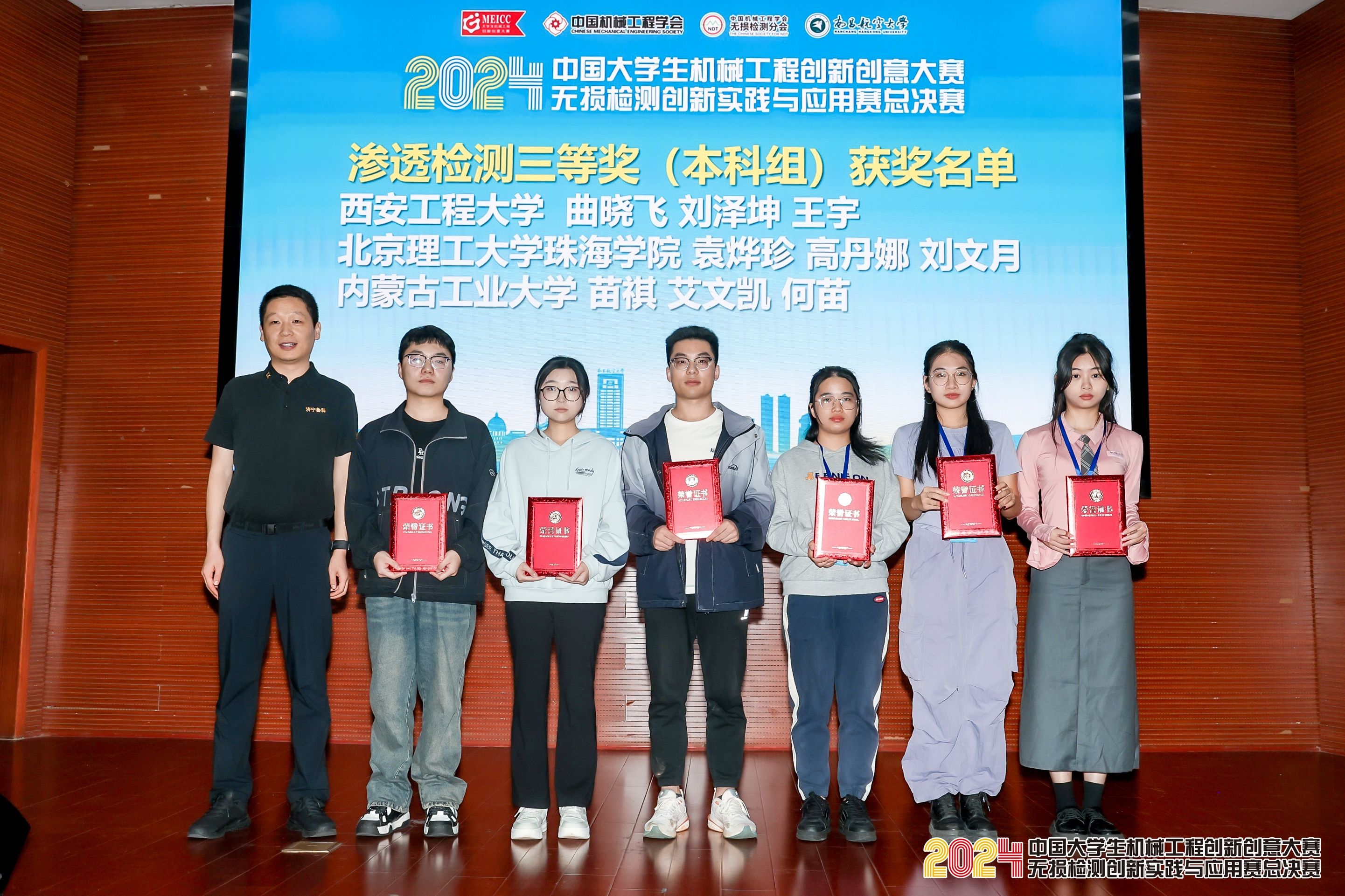 大賽頒獎(jiǎng)環(huán)節(jié),濟(jì)寧魯科薛建祥總經(jīng)理為滲透檢測(cè)獲獎(jiǎng)學(xué)生頒獎(jiǎng),并合影留念。